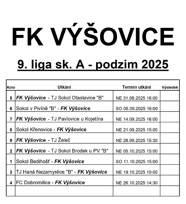 Rozpis utkání FK Výšovice pro podzimní část sezóny 2025/26.